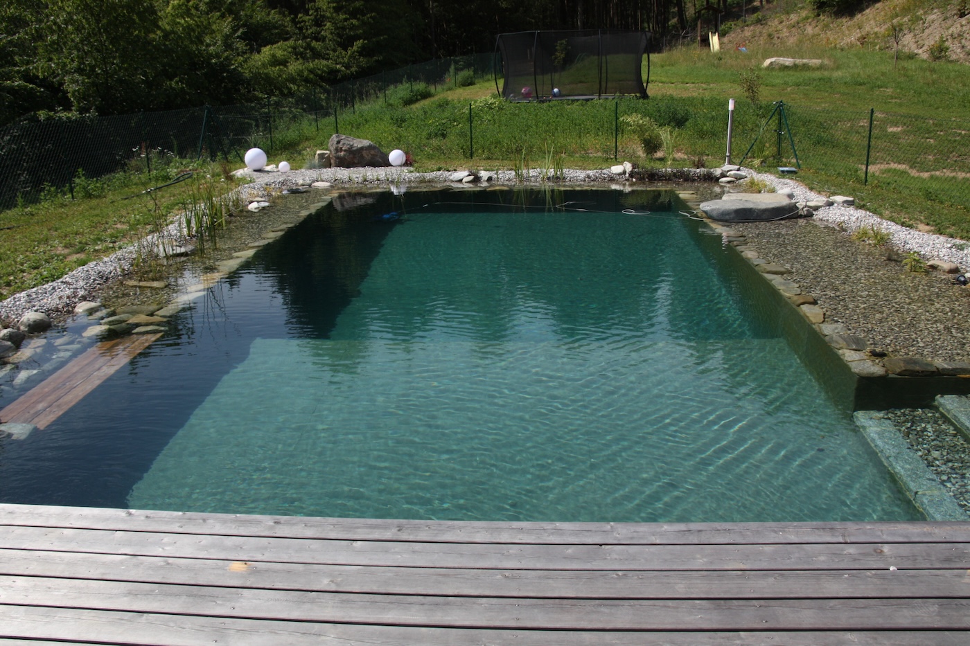 Der Schwimmteich ist eine Symbiose zwischen Natur und Technik und besteht immer aus zwei Zonen: einen Schwimmbereich der tief und unbepflanzt ist, und einem Flachwasserbereich mit verschiedenen Teichpflanzen. Die Abtrennung erfolgt z.B. durch Mauer, Findlinge oder Teichsäcke. Durch Flachwasserbereiche in Schwimmteichen und Naturpools erwärmt sich das Wasser sehr schnell und macht ein zeitiges Badevergnügen möglich. Um so rasch wie möglich das biologische Gleichgewicht in Schwimmteichen und Naturpools herzustellen “impfen” wir das Füllwasser mit verschiedenen einzelligen Mikroorganismen. Diese Einzeller sind im wesentlichem für die Sauberkeit und das biologische Selbstreinigungsvermögen des Wassers verantwortlich. Dadurch wird das Baden im chemiefreien Wasser in natürlicher Umgebung zu einem besonderen Genuss.